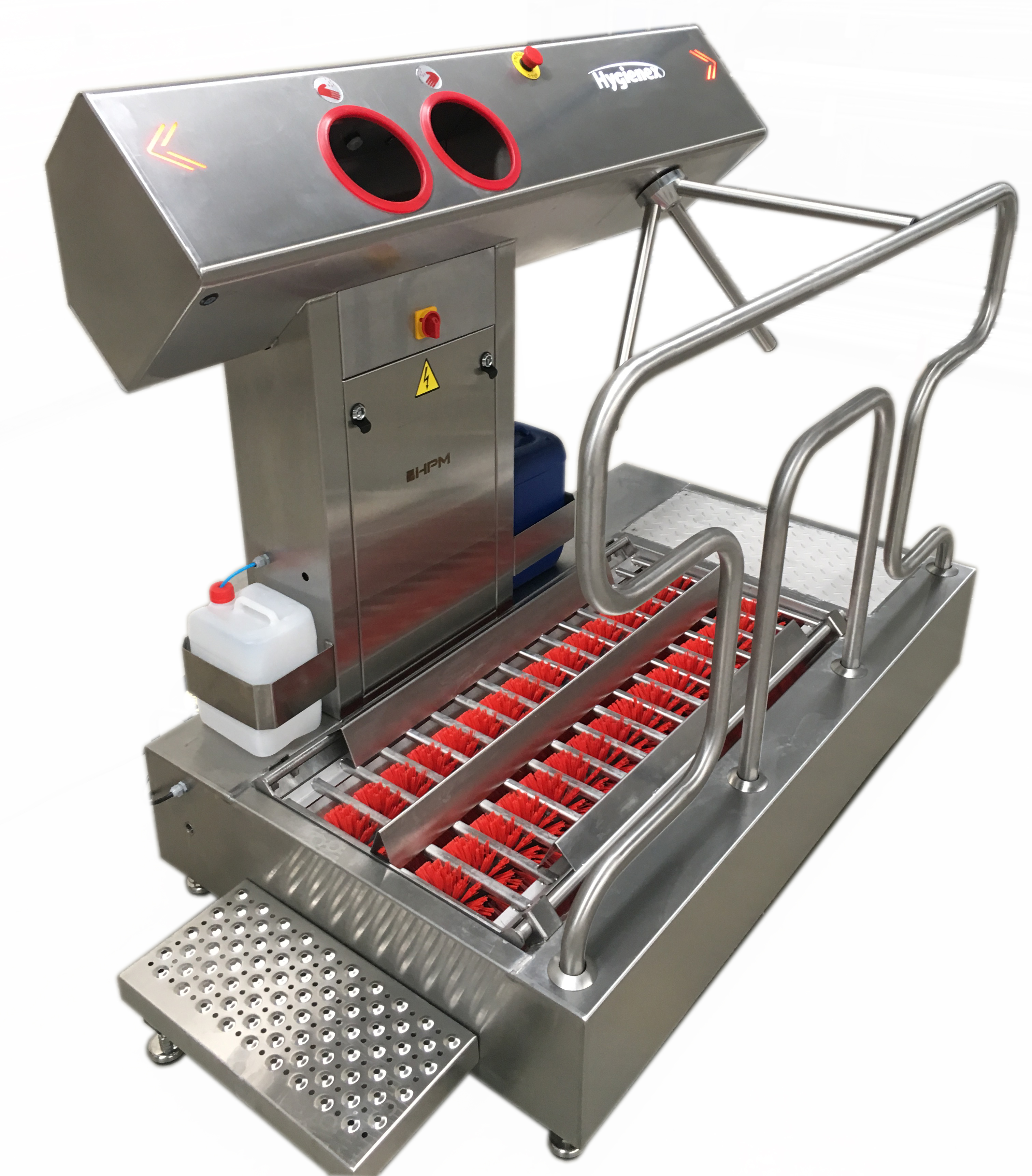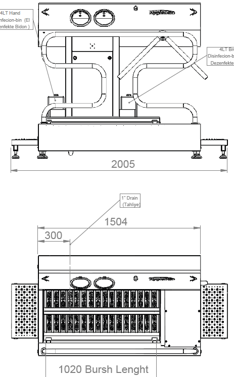 Taban Firçalamali Hijyen bariyeri ayakkabi kullanilan isletmeler için tasarlanmis olup, temassiz el kurutma (opsiyonel) ve çift el dezenfeksiyon islemlerini saglar. Yüksek güvenilirlikli rijit-robust olacak sekilde tasarlanmistir. Genel olarak çift-el dezenfektanli turnike geçis kontrolü, PLC sistemi ile islem takibi yapar ve herhangi bir asamanin atlanmasina izin vermez. Paslanmaz dezenfektan püskürtücü nozullar, yükseklik ayarli ayaklar, çizilmeyi önleyen plastik ayak kisimlari, ayak havuzunda yatay firçalar mevcuttur ve tamami paslanmaz çelik malzeme olacak sekilde üretilmektedir. CE sertifikali ve HACCP kurallarina uygundur.